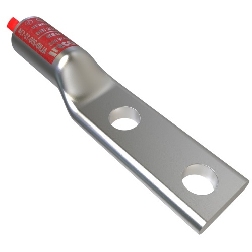 Ilsco ALND-250-12-134 - Surecrimp Aluminum Compression Lug for 250 kcmil stranded aluminum conductors. 2-hole design with 1/2in bolt size, 1-3/4in hole spacing. Long barrel with tin plating, UL and CSA listed. Temperature rating of 90°C, voltage rating of 35 kV. Contains DE-OX®. Tang dimensions: 3in length, 1.264in width, 0.329in thickness. Color code: Red.