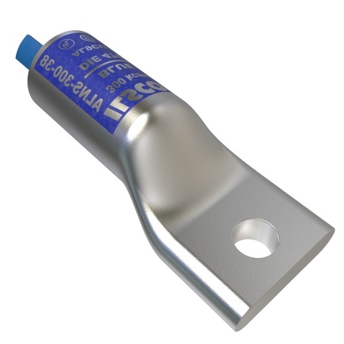Ilsco ALNS-300-38 - Surecrimp Aluminum Compression Lug for 300 kcmil stranded aluminum conductors. Tin plated finish, UL, CSA, NEMA Code S-588-3. Long barrel with 3/8in bolt size. 35 kV voltage rating, 90°C temperature rating. One-hole design, tang thickness of 0.36in. Mounting hole size 0.406in. DE-OX® included, barrel marking for durability.