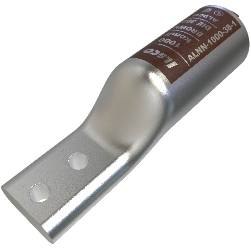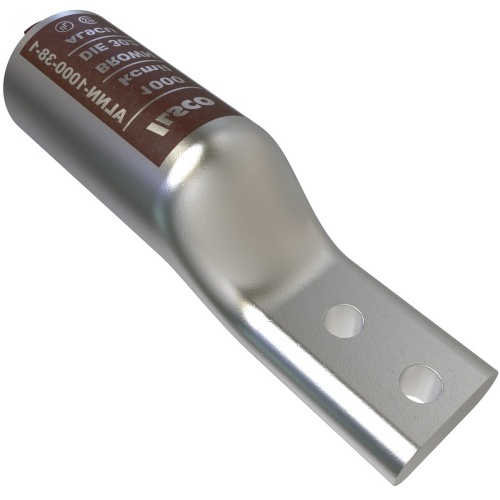 Ilsco ALNN-1000-38-1 - Surecrimp Aluminum Compression Lug for 1000 kcmil stranded copper conductors. 2-hole design with 3/8in bolt size, 1in hole spacing, and narrow tang. Long barrel with tin plating. Dual rated with 35kV voltage rating. UL, CSA, NEMA codes. Suitable for 180° connections. Ideal for high-power applications. Color: Silver. Tin finish.