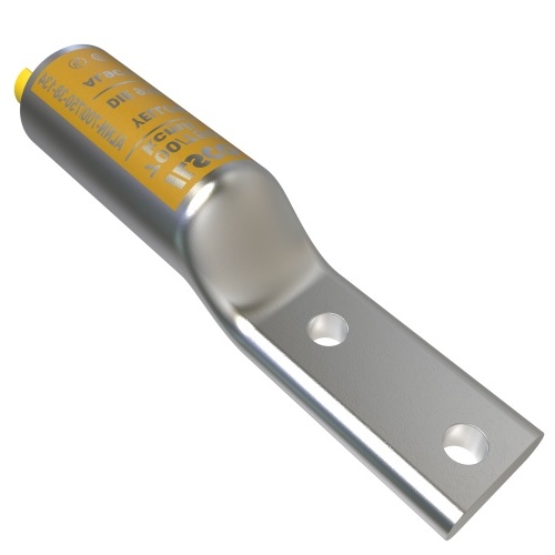 Ilsco ALNN-700/750-38-134 - Surecrimp Aluminum Compression Lug for 750 kcmil - 700 kcmil conductors. 2-hole design with 3/8in bolt size and 1-3/4in hole spacing. Long barrel, narrow tang, tin plated finish. UL, CSA, NEMA S-588-3 rated. 35 kV voltage, 90°C temperature rating. Dual rated for copper and aluminum. DE-OX® included. Mounting hole spacing 44.45mm.