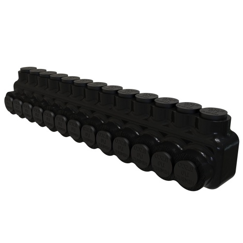 Ilsco PBTS-13-1/0 - The Nimbus Insulated Aluminum Multi-Tap Connector with 13 ports for conductor ranges 1/0-14. Tin plated, UL/CSA/NEMA rated, with 90°C temperature rating. Suitable for solid and stranded aluminum/copper conductors. Features DE-OX®, aluminum construction, and mechanical connections. Torque 45 in-lbs. Cold temperature rated to -45°C. Black color, 600V voltage rating.