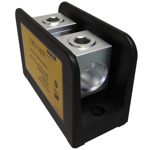 Ilsco PDB-11-350-1 - Power Distribution Block, Dual Rated for 350-6 Line/Load Range, 1 Pole with 1 Port per Pole. UL and CSA listed, NEMA Code S-588-4, with Aluminum construction and Tin finish. Rated for 600V and 310A, suitable for solid and stranded conductors. Mounting holes for #10 bolts, with 2 ports and wire binding screws per pole.