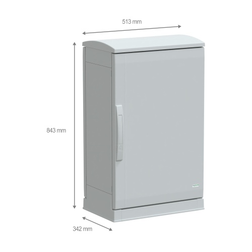 Schneider Electric Thalassa PLA enclosure is a floor-standing, suitable enclosure made of polyester reinforced with fiberglass. It features a solid front door that can be opened on either side and locked with a 2-point handle lock. The enclosure is accessible from the bottom, rear, top, and front, offering flexibility for operation. With a nominal depth of 12.60 inches, a nominal height of 29.53 inches, and a nominal width of 19.69 inches, it provides ample space for equipment. It also boasts Class II electrical insulation, IK10 degree of protection, and fire resistance up to 1760°F.
