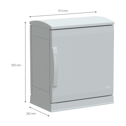 Schneider Electric Thalassa PLA enclosure (Original NSYPLAZT553G) is a floor-standing enclosure made of polyester reinforced with fiberglass. It features a solid front door with reversible 180° opening and a 2-point handle lock. The enclosure has front, rear, top, and bottom accessibility for operation. With dimensions of 19.69" x 19.69" x 19.69" (500mm x 500mm x 500mm) and a depth of 12.60" (320mm), it offers ample space for equipment. It has Class II electrical insulation, IK10 degree of protection against impact, and fire resistance of 1760°F (960°C).
