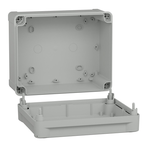 Introducing the Thalassa TBP Wall Mounted Enclosure from Schneider Electric. Made of durable polycarbonate material in gray color (RAL 7035), it features a high plain cover with removable parts secured by captive screws. With an internal space of 6.89" x 8.86" x 4.72", it is suitable for outdoor use (with canopy or shelter) and offers excellent fire resistance of up to 1760°F (960°C). Perfect for Class II electrical insulation, the TBP ensures safe storage in temperatures ranging from -13°F to 176°F (-25°C to 80°C).