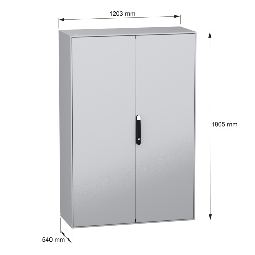 Schneider Electric NSYSM1812502D Spacial SM enclosure is made of body and door sheet steel, with a 4-point lock and black handle. The gray enclosure features two front doors, with solid construction and left/right 120° opening. The floor-standing design is accessible for front operation, with standard gland plates and no mounting plate included.