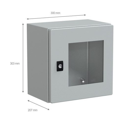 The compact enclosure is made of steel (body), steel and security glass (door), making it durable and resistant