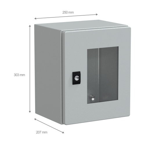 The compact enclosure is made of steel (body), steel and security glass (door), making it durable and resistant
