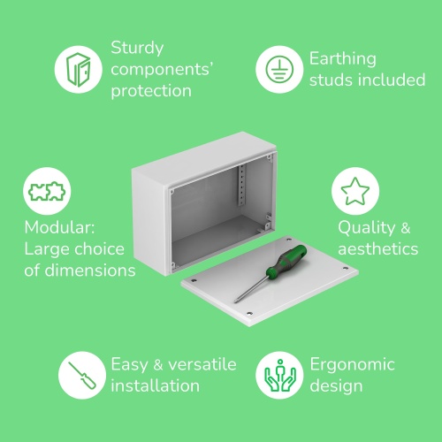 Schneider Electric Spacial SBM is a gray RAL 7035 wall-mounted enclosure made of sheet steel, perfect for various industrial applications. Featuring a plain door with captive screw cover fixing, it provides easy access and security. With a polyester powder finish, it ensures durability and can withstand temperatures from -31°F to 176°F (-35°C to 80°C).
