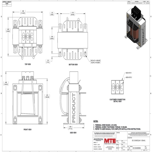 MTE DCA000904 - DC Link Chokes, also known as DC line chokes or inductor chokes, are essential components for filtering and controlling DC bus voltage and current in variable speed drives and inverters. They effectively reduce AC input line current harmonic distortion and absorb DC bus voltage spikes, enhancing power quality and system reliability. These chokes offer the advantage of maximizing circuit inductance without causing AC input line voltage drop and can be used individually or in pairs for additive inductance. While they increase internal filtering and absorb spikes, they do not protect the input bridge rectifier or inverter output circuit. Special features include solid copper box lug type terminals and epoxy impregnation for low noise. Ideal for various applications such as AC PWM inverters/drives and electrical vehicle inverters, MTE's DC Link Chokes help meet IEEE-519 limits, reduce ripple on the DC bus, and mitigate over-voltage tripping, providing a robust solution for power quality challenges in industrial environments.