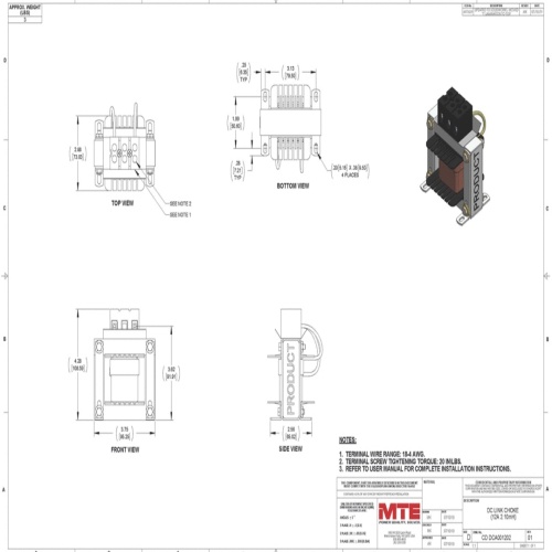 MTE DCA001202 - DC Link Chokes, also known as DC line chokes or inductor chokes, are essential components for filtering and controlling DC bus voltage and current in variable speed drives and inverters. They effectively reduce AC input line current harmonic distortion and absorb DC bus voltage spikes, enhancing power quality and system reliability. These chokes offer the advantage of maximizing circuit inductance without causing AC input line voltage drop and can be used individually or in pairs for additive inductance. While they increase internal filtering and absorb spikes, they do not protect the input bridge rectifier or inverter output circuit. Special features include solid copper box lug type terminals and epoxy impregnation for low noise. Ideal for various applications such as AC PWM inverters/drives and electrical vehicle inverters, MTE's DC Link Chokes help meet IEEE-519 limits, reduce ripple on the DC bus, and mitigate over-voltage tripping, providing a robust solution for power quality challenges in industrial environments.