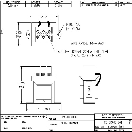 MTE DCA001801 Series A DC Link Choke - 1000 Volt (DC), 0.65mH, 18 Amp, Open