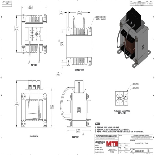 MTE DCA001803 - DC Link Chokes, also known as DC line chokes or inductor chokes, are essential components for filtering and controlling DC bus voltage and current in variable speed drives and inverters. They effectively reduce AC input line current harmonic distortion and absorb DC bus voltage spikes, enhancing power quality and system reliability. These chokes offer the advantage of maximizing circuit inductance without causing AC input line voltage drop and can be used individually or in pairs for additive inductance. While they increase internal filtering and absorb spikes, they do not protect the input bridge rectifier or inverter output circuit. Special features include solid copper box lug type terminals and epoxy impregnation for low noise. Ideal for various applications such as AC PWM inverters/drives and electrical vehicle inverters, MTE's DC Link Chokes help meet IEEE-519 limits, reduce ripple on the DC bus, and mitigate over-voltage tripping, providing a robust solution for power quality challenges in industrial environments.
