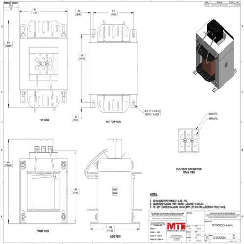 MTE DCA002505 - DC Link Chokes, also known as DC line chokes or inductor chokes, are essential components for filtering and controlling DC bus voltage and current in variable speed drives and inverters. They effectively reduce AC input line current harmonic distortion and absorb DC bus voltage spikes, enhancing power quality and system reliability. These chokes offer the advantage of maximizing circuit inductance without causing AC input line voltage drop and can be used individually or in pairs for additive inductance. While they increase internal filtering and absorb spikes, they do not protect the input bridge rectifier or inverter output circuit. Special features include solid copper box lug type terminals and epoxy impregnation for low noise. Ideal for various applications such as AC PWM inverters/drives and electrical vehicle inverters, MTE's DC Link Chokes help meet IEEE-519 limits, reduce ripple on the DC bus, and mitigate over-voltage tripping, providing a robust solution for power quality challenges in industrial environments.