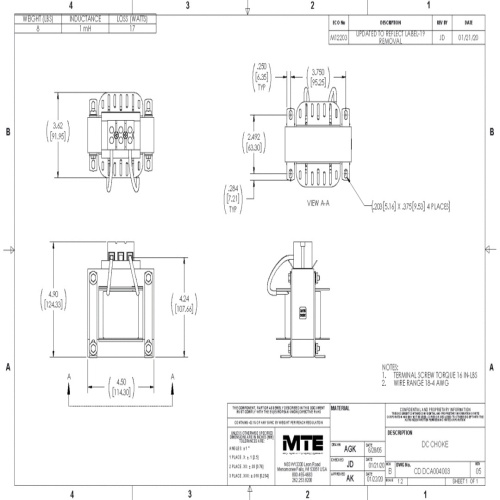 MTE DCA004003 Series A DC Link Choke - 1000 Volt (DC), 1mH, 40 Amp, Open, 300 Hz, 360 Hz
