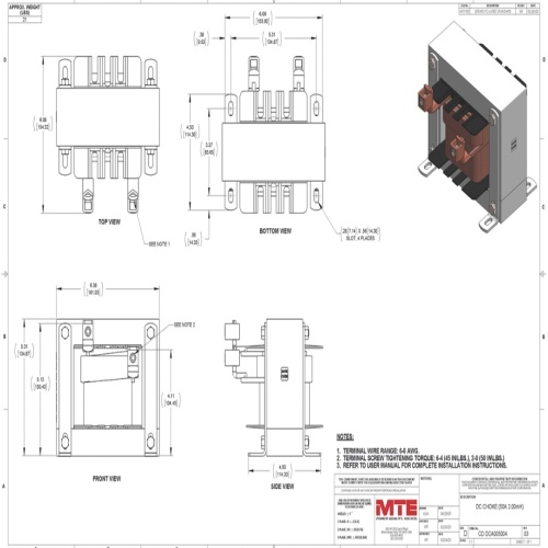 MTE DCA005004 - DC Link Chokes, also known as DC line chokes or inductor chokes, are essential components for filtering and controlling DC bus voltage and current in variable speed drives and inverters. They effectively reduce AC input line current harmonic distortion and absorb DC bus voltage spikes, enhancing power quality and system reliability. These chokes offer the advantage of maximizing circuit inductance without causing AC input line voltage drop and can be used individually or in pairs for additive inductance. While they increase internal filtering and absorb spikes, they do not protect the input bridge rectifier or inverter output circuit. Special features include solid copper box lug type terminals and epoxy impregnation for low noise. Ideal for various applications such as AC PWM inverters/drives and electrical vehicle inverters, MTE's DC Link Chokes help meet IEEE-519 limits, reduce ripple on the DC bus, and mitigate over-voltage tripping, providing a robust solution for power quality challenges in industrial environments.