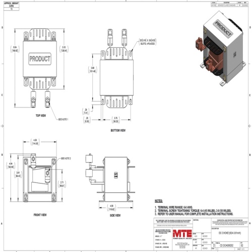 MTE DCA006202 - DC Link Chokes, also known as DC line chokes or inductor chokes, are essential components for filtering and controlling DC bus voltage and current in variable speed drives and inverters. They effectively reduce AC input line current harmonic distortion and absorb DC bus voltage spikes, enhancing power quality and system reliability. These chokes offer the advantage of maximizing circuit inductance without causing AC input line voltage drop and can be used individually or in pairs for additive inductance. While they increase internal filtering and absorb spikes, they do not protect the input bridge rectifier or inverter output circuit. Special features include solid copper box lug type terminals and epoxy impregnation for low noise. Ideal for various applications such as AC PWM inverters/drives and electrical vehicle inverters, MTE's DC Link Chokes help meet IEEE-519 limits, reduce ripple on the DC bus, and mitigate over-voltage tripping, providing a robust solution for power quality challenges in industrial environments.