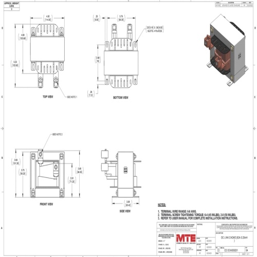 MTE DCA009201 - DC Link Chokes, also known as DC line chokes or inductor chokes, are essential components for filtering and controlling DC bus voltage and current in variable speed drives and inverters. They effectively reduce AC input line current harmonic distortion and absorb DC bus voltage spikes, enhancing power quality and system reliability. These chokes offer the advantage of maximizing circuit inductance without causing AC input line voltage drop and can be used individually or in pairs for additive inductance. While they increase internal filtering and absorb spikes, they do not protect the input bridge rectifier or inverter output circuit. Special features include solid copper box lug type terminals and epoxy impregnation for low noise. Ideal for various applications such as AC PWM inverters/drives and electrical vehicle inverters, MTE's DC Link Chokes help meet IEEE-519 limits, reduce ripple on the DC bus, and mitigate over-voltage tripping, providing a robust solution for power quality challenges in industrial environments.
