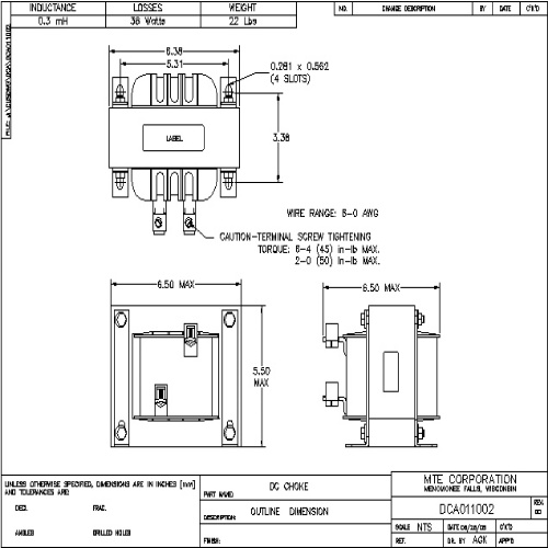 MTE DCA011002 Series A DC Link Choke - 1000 Volt (DC), 0.3mH, 110 Amp, Open