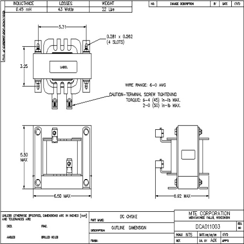 MTE DCA011003 Series A DC Link Choke - 1000 Volt (DC), 0.45mH, 110 Amp, Open
