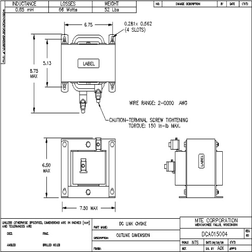 MTE DCA015004 Series A DC Link Choke - 1000 Volt (DC), 0.65mH, 150 Amp, Open