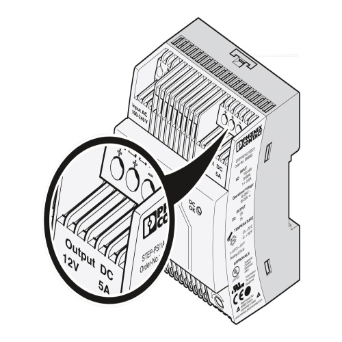 Phoenix Contact 2868583 A standard stepped-down power supply unit is mounted on a DIN rail and can be powered by a single-phase electrical current, producing an output voltage of 12V DC while supplying up to 5 amps of electric current.
