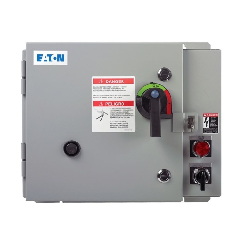 Eaton ECH1601TAC - Freedom NEMA motor control starter, 208V/60 Hz, NEMA 0, Combination non-reversing—fusible disconnect, HAND/OFF/AUTO with red RUN pilot device, 7A magnetic circuit protector - 14.37" x 16.26" x 6.7" (HxWxD)