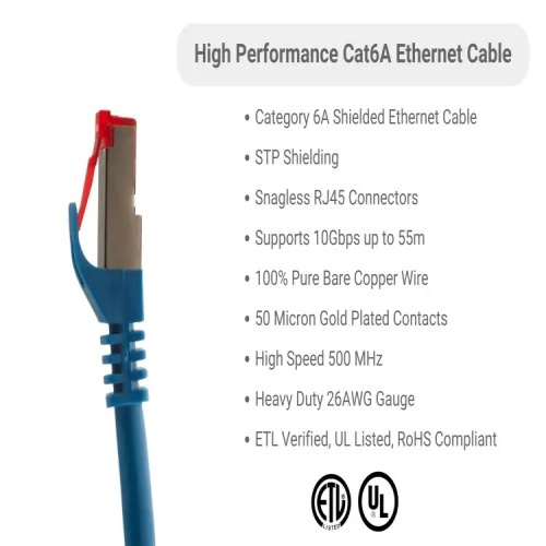 Cable PC6AS-BL-03-EZ - Cat 6A Shielded Ethernet Patch Cables, Snagless, 3 ft, Blue