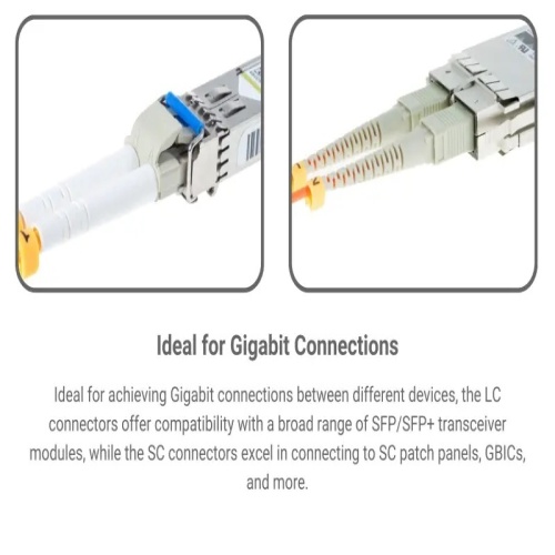 OM2 50/125 multimode fiber patch cable commonly used for Gigabit connections (can reach 10G speeds in select scenarios).