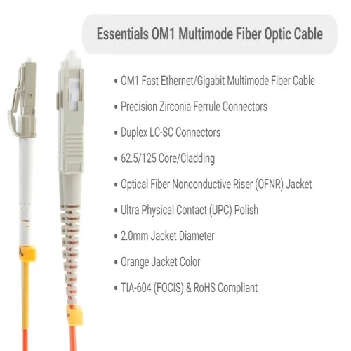 Multimode OM1 fiber patch cable designed for transmitting data at rates up to 1 Gbps.