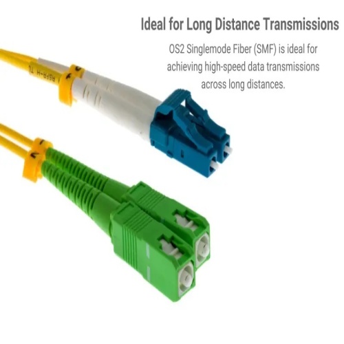 OS2 singlemode fiber (SMF) patch cable with 9/125 micron core/cladding designed to allow for signal integrity over long distances.