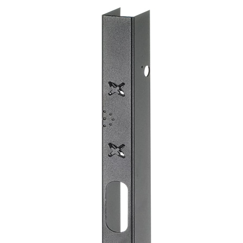 The bracket mounts on either the left or right side of 700- and 800-mm cabinets between the frame and the rack angle to create vertical wiring space