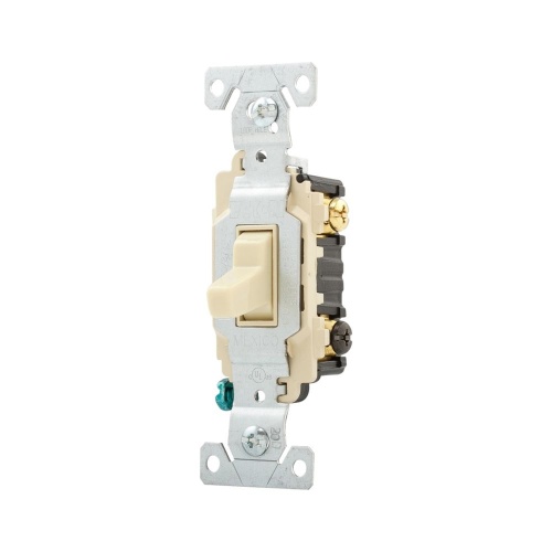 Eaton 1303-7V - toggle switch, #14-10 AWG, 15A, Residential, Flush, 120V, Back and side, push wire, Screw, Ivory, Load type: Motor Control, Fan, LED, Incandescent, ELV, MLV, CFL, Flourescent, Halogen, Single-Pole, Three-Way, Three-Way