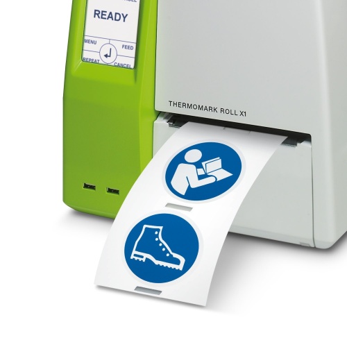 Phoenix Contact 1014181 A mandatory sign with roll options is available in various formats including THERMOMARK E.300 (D)/600 (D), THERMOMARK ROLL 2.0, THERMOMARK ROLL, THERMOMARK ROLL X1, and THERMOMARK ROLLMASTER 300/600. The available roll has a diameter of 100 mm with adhesive mounting, allowing for the use of up to 250 individual labels, including blank ones.