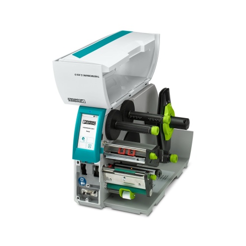 Phoenix Contact 1287040 A thermal transfer printer equipped with an internal rewinder is ideal for high-volume production and long-term usage, capable of handling all types of materials in roll format at a precise 600 dpi resolution, allowing for efficient processing of large rolls.