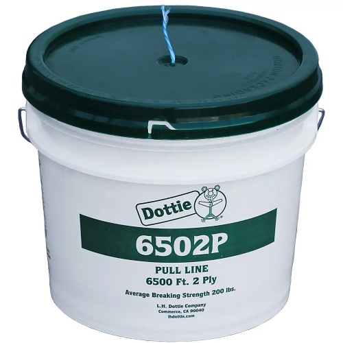 Dottie 6502PZ - 6500' Two Ply Pull Line (Dispensing Pail) made of Polypropylene for pulling wire through conduit and pipe. Features easy dispensing lid, tangle resistance, and reusability in conduit. Compatible with Vacuum/Blower and Power Fishing Pistons. Blue/White color, 1/8'' diameter, 200 lbs tensile strength. Package type: Pail.