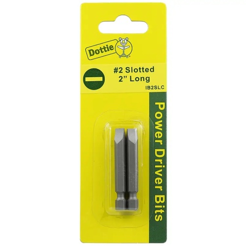 Dottie IB2SLC - #2 x 2'' Slotted Power Bit (Carded) is made of S2 Carbon Steel with a Rockwell Hardness of 58 - 62 HRC. It is a hex shank type with quick change capabilities and is designed for #8-10 screws. Ideal for general fastening applications, the power bit is packaged in a carded format.