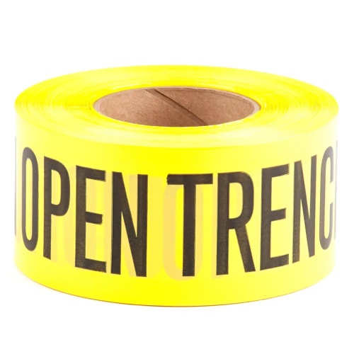 Dottie BT19 - 3'' x 1000' Yellow Barricade Tape (Caution Open Trench) is a Polyethylene Barricade Tape suitable for marking above ground hazardous areas. Features include continuous warning, pliability in cold climates, and reusable design. Unleaded pigment and ink ensure safety. Tensile strength: Width: 11.4 N/10mm, Length: 8.9 N/10mm.