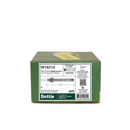 Dottie W14314 - 1/4'' x 3-1/4'' Wedge Anchor is made of Carbon Steel, ideal for Normal and Lightweight Concrete, Seismic Zones, and Crack & Uncracked Concrete. Features include Zinc Plated Finish, UNC Thread Type, and Pilot End for easy installation. Pre-Drill Size of 1/4'', Anchor Length of 3-1/4''.