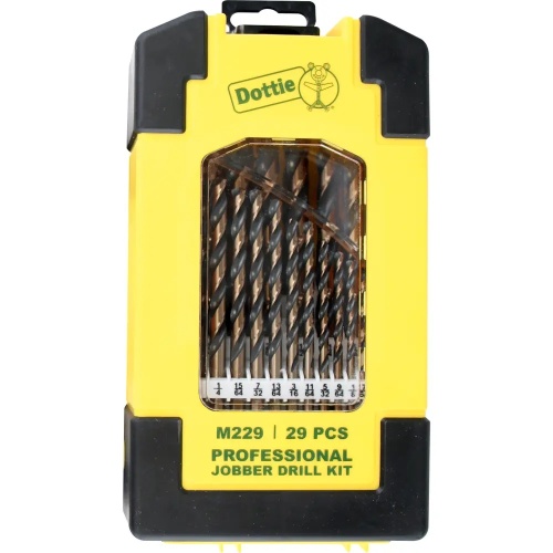 Dottie M229 - 29 Pc High Speed Steel Drill Kit is made of M2 High Speed Steel in a black & gold finish. It is designed for use with a 1/2'' chuck drill, with a split point type, 135° drill point, and spiral flute type. Suitable for steel, cast iron, wood, plastic, and more. RPM up to 1800. Kit contains drills from 1/16'' to 1/2'' x 64ths. Ideal for heavy duty jobber tasks.
