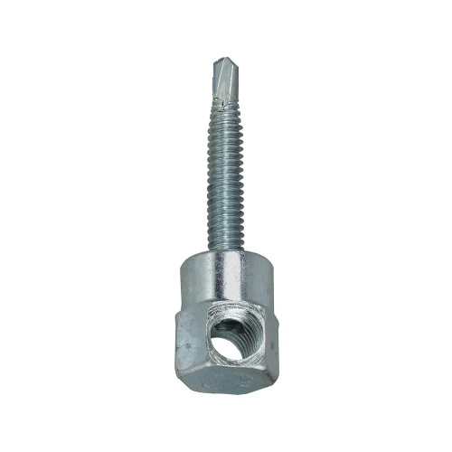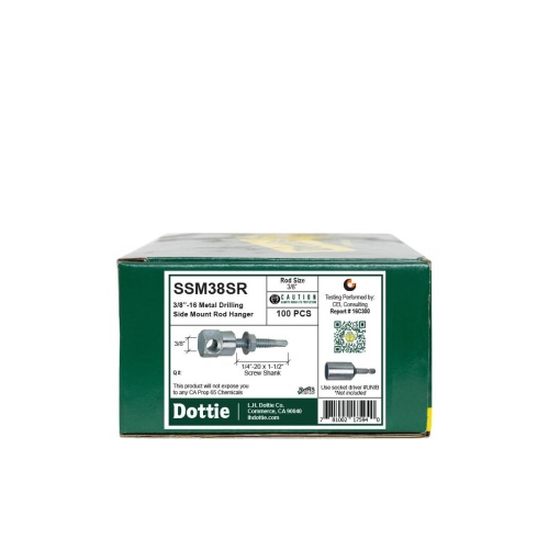 Dottie SSM38SR - 3/8''-16 Metal Drilling Side Mount Rod Hanger is made of carbon steel with a zinc-plated finish. It features a self-drilling tip for easy installation without pre-drilling, low torque to install, and a one-piece design. Designed for steel joists, beams, and purlins. Thread type is UNC with a 1/4''-20 pitch. Screw size is 1/4''-20 x 1-1/2''. Head diameter is 5/8''. Suitable for various applications as a rod hanger anchor.