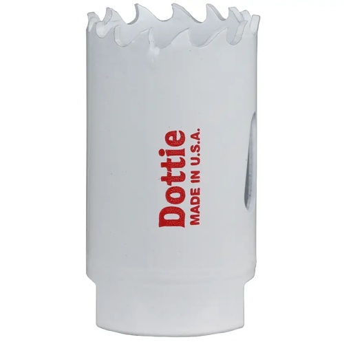 Dottie VP10 - 5/8'' Bi-Metal Variable Pitch Hole Saw is made of M42 Cobalt with a Rockwell Hardness of 66-68 HRC. Ideal for cutting Stainless Steel, Iron, Pipe, Wood, and Plastic. Features a white color, construction, and RPM of up to 1800. Perfect for varied cutting applications.