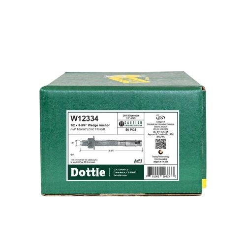 Dottie W12334 - 1/2'' x 3-3/4'' Wedge Anchor is made of carbon steel with a zinc plated finish. Suitable for normal and lightweight concrete, seismic zones, and crack/uncracked concrete. Features include a carbon steel body, expansion clip, and pilot end to prevent thread damage. Thread type is UNC with 1/2''-13 thread pitch.