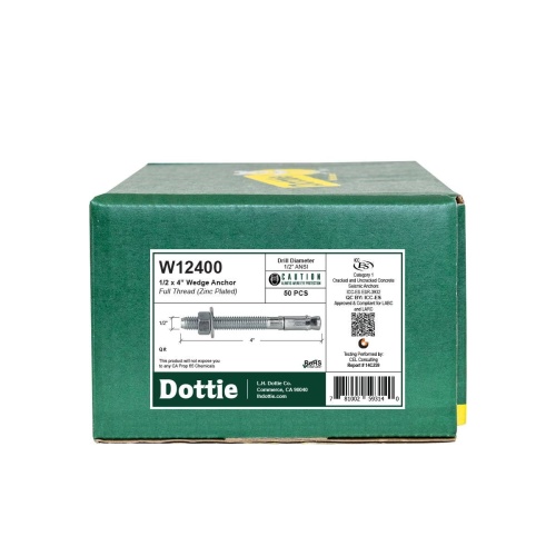 Dottie W12400 - 1/2'' x 4'' Wedge Anchor is made of durable carbon steel with a zinc plated finish. Featuring a pilot end to prevent first thread damage, this anchor is suitable for normal and lightweight concrete, seismic zones, crack and uncracked concrete. Thread style is fully with 1/2''-13 thread per inch.
