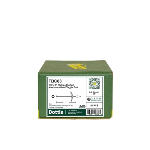 Dottie TBC83 - 1/8'' x 3'' Phillips/Slotted Mushroom Head Toggle Bolt is a carbon steel anchor suitable for hollow block, wallboard, plaster, and plywood installations. Its adjustable design is contractor-oriented for ease of use on various thicknesses. The zinc-plated finish and mushroom head ensure even load distribution. Pre-drill size: 3/8'', Bit size: #3.