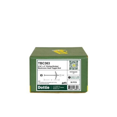 Dottie TBC363 - 3/16'' x 3'' Phillips/Slotted Mushroom Head Toggle Bolt is made of carbon steel with zinc plating. It is ideal for hollow base materials like block, wallboard, and plywood. Features adjustable thickness, contractor-friendly design, and even load distribution. UNC thread, 3/16''-24 pitch, with a 1/2'' pre-drill size and #2 bit required.