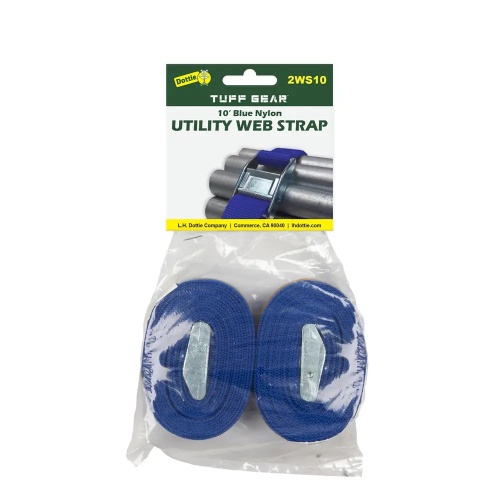 Dottie 2WS10 - 10' Blue Nylon Web Straps (2 Pack) are durable and versatile web straps made of rust-resistant nylon. The cam-lock buckle allows for easy tightening and release. Color-coded for quick length selection. Each 1'' strap is rated for loads less than 100 lbs. Ideal for bundling and securing loads.