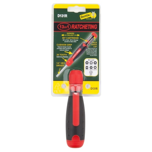 Dottie D131R - 13 in 1 Ratcheting Screwdriver is a versatile tool suitable for commercial, industrial, and residential use. It features a heavy-duty nylon reinforced handle, chamfered solid steel shaft for durability, and a cushion grip for comfort. The tapered design handle reduces fatigue, and the shank shape is hexagonal.
