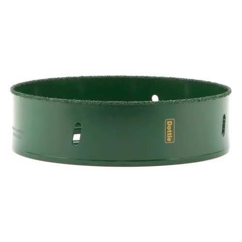 Dottie 425C - 4-1/4'' Kan-Cut Carbide Recessed Lighting Hole Saw is a durable and versatile tool for cutting through various materials such as stucco, lath, plaster, and plywood. With a rockwell hardness of 68-70 HRC, it features a solid one-piece construction and a powder-coated finish. Suitable for use at speeds up to 1800 RPM.