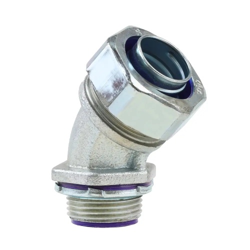 45° Insulated Steel Liquid Tight Connectors accommodate bends or turns in conduit runs and are used to connect liquid tight conduit into an enclosure